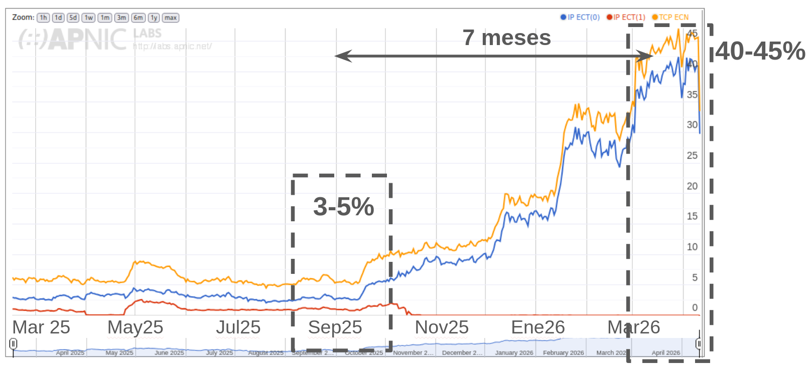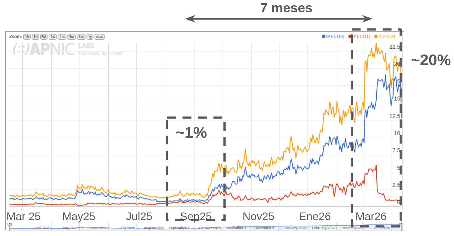 Linux (kernel 2.4, 2001): ECN configurable (tcp_ecn=1) · kernel 2.4.20 (2002): pasivo por defecto (tcp_ecn=2).